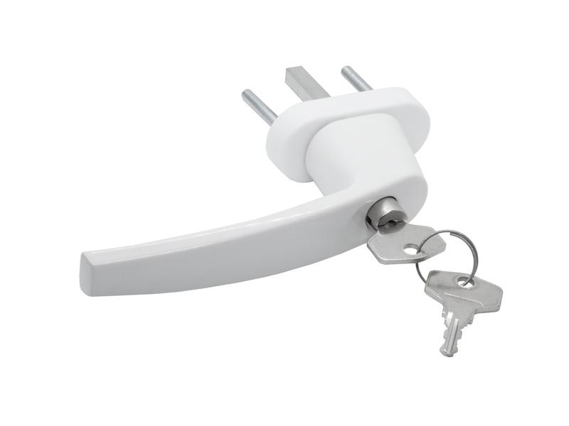 Univerzálna kľučka na okná. Je možné uzamknúť ju aj v polohe vetrania. Uzamykanie je jednoduchým zatlačením vložky do kľučky.